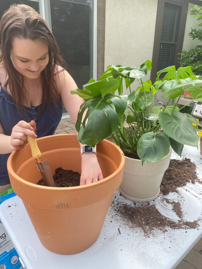 This was my star monstera back in 2022 getting repotted into her current pot- honestly I am avoiding going bigger for now because we are renting again and planning to buy a house in 2025 and she is already insanely heavy!!
